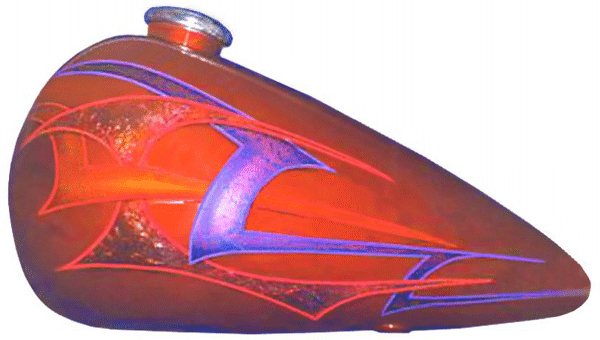 Base Candy Cherry Red with subtle Gold pearl design under graphics Graphics are Violet Blue Metallic base with Candy Blue Shading, Second graphic has Yellow Pearl base with Candy Red Fade Third graphic has Variegated Red Gold leaf base with Candy Magenta Highlights Lt. Blue, Red, & Orange Stripping and Drop Shadows to accent graphics |