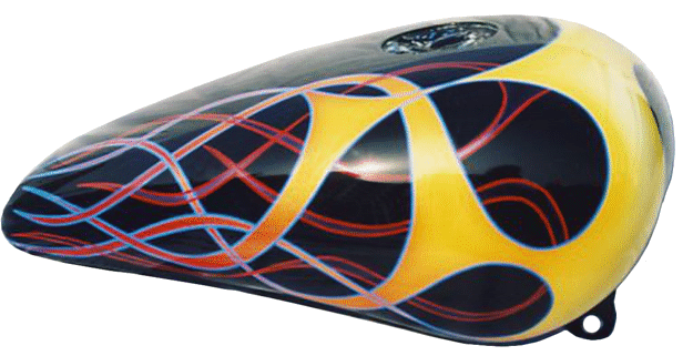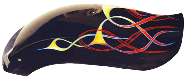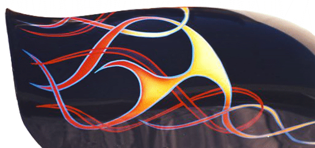 Base is Black with Graphite Pearl added Main Flames are Pearl White with a fade to Yellow, Orange, and Red with Light Blue striping Ghost Flames are Purple Pearl Fade with Roman Red striping.
