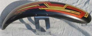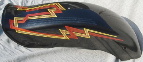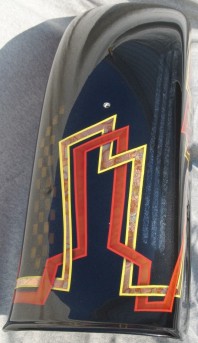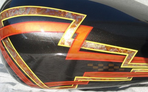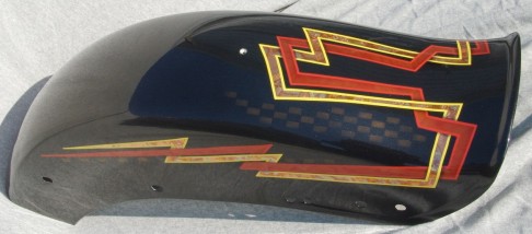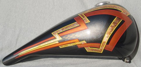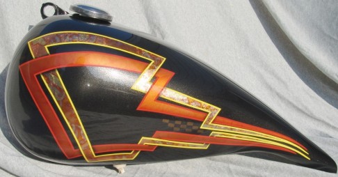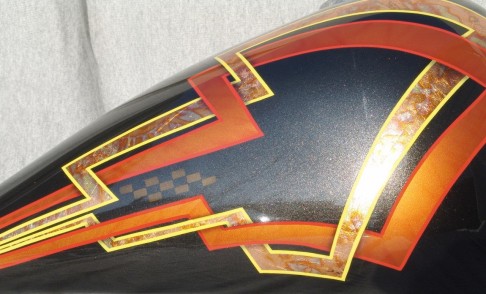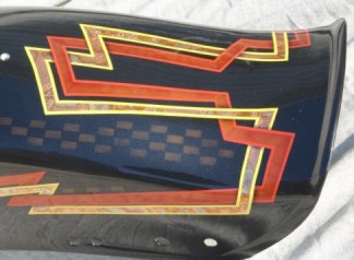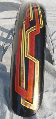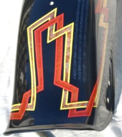 Base is a Coarse Metallic Black Graphics are Variegated Red Gold leaf Graphic accents are done with Striping is done in Lemon Yellow and Roman Red |